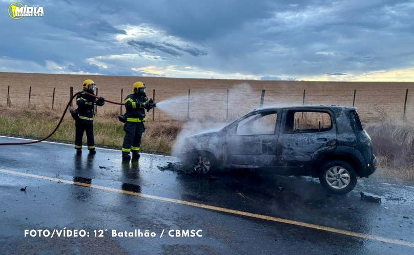 Veículo é destruído por incêndio na zona rural de Cunha Porã